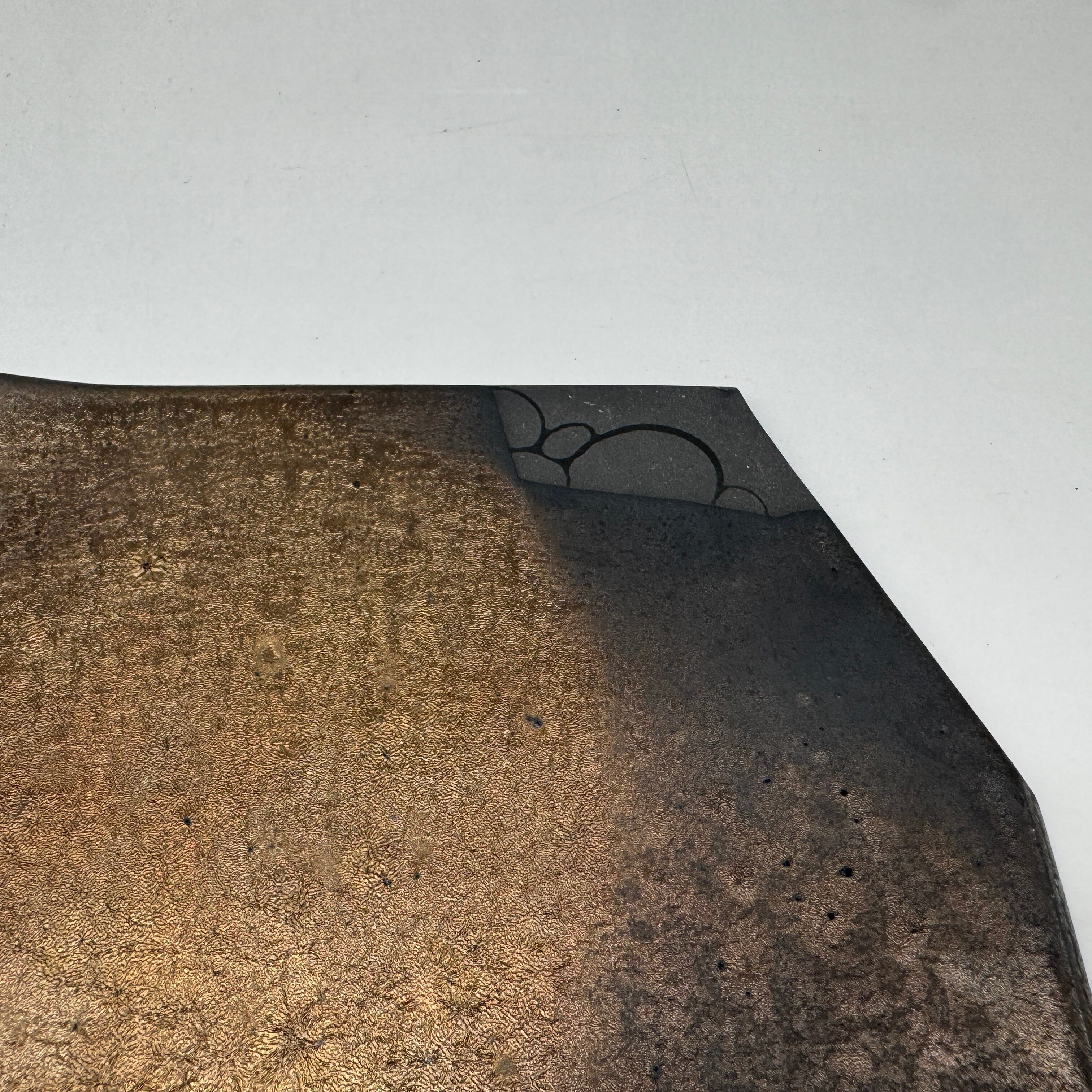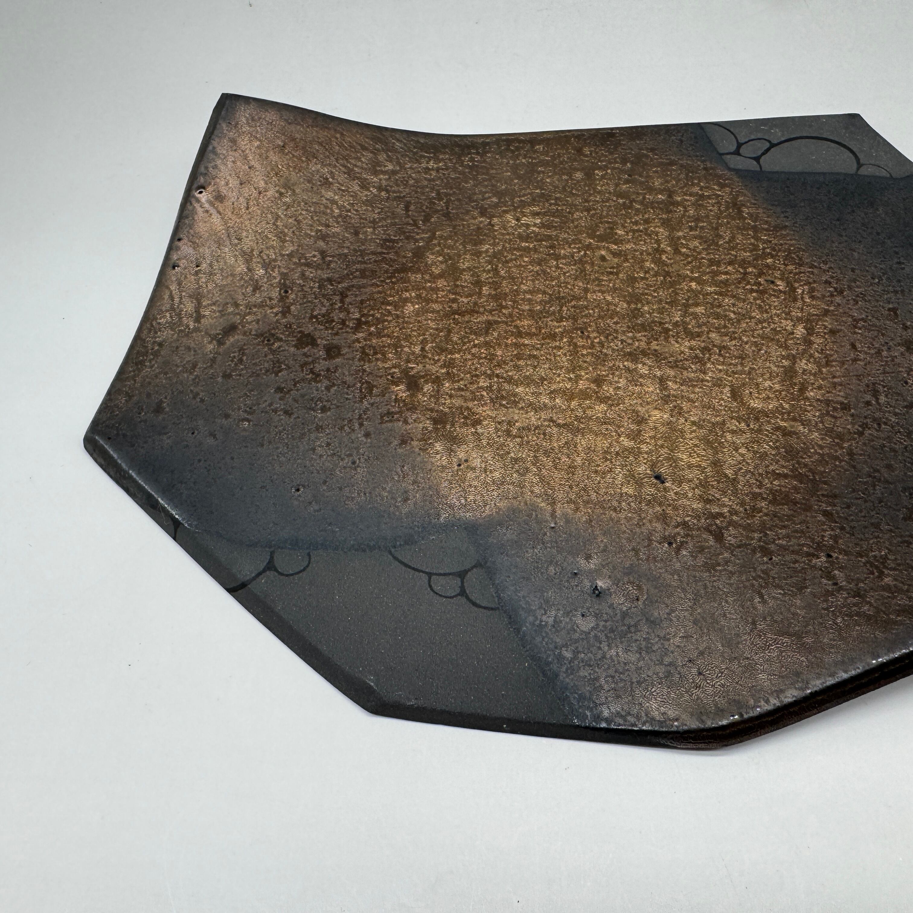 九谷焼の上絵の具を用いて一つ一つ手書きで上絵付けした、細胞紋の黒波板皿です。